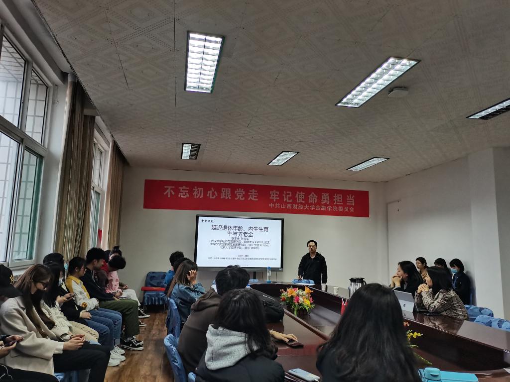 welcome光临必发集团2020-2021学年第二学期第2期学术沙龙活动于2021年04月06日晚在学院会议室如期举行。本次沙龙主题为“延迟退休年龄、内生生育率与养老金”,由2020级保险专硕谭骁同学作为主讲人来为大家进行汇报讲解。此次学术沙龙很荣幸邀请到王华丽老师、闫丽瑞老师来担任讲评嘉宾。现场参加学术沙龙的有近80位来自welcome光临必发集团各专业、各年级的研究生同学,现场气氛十分活跃。