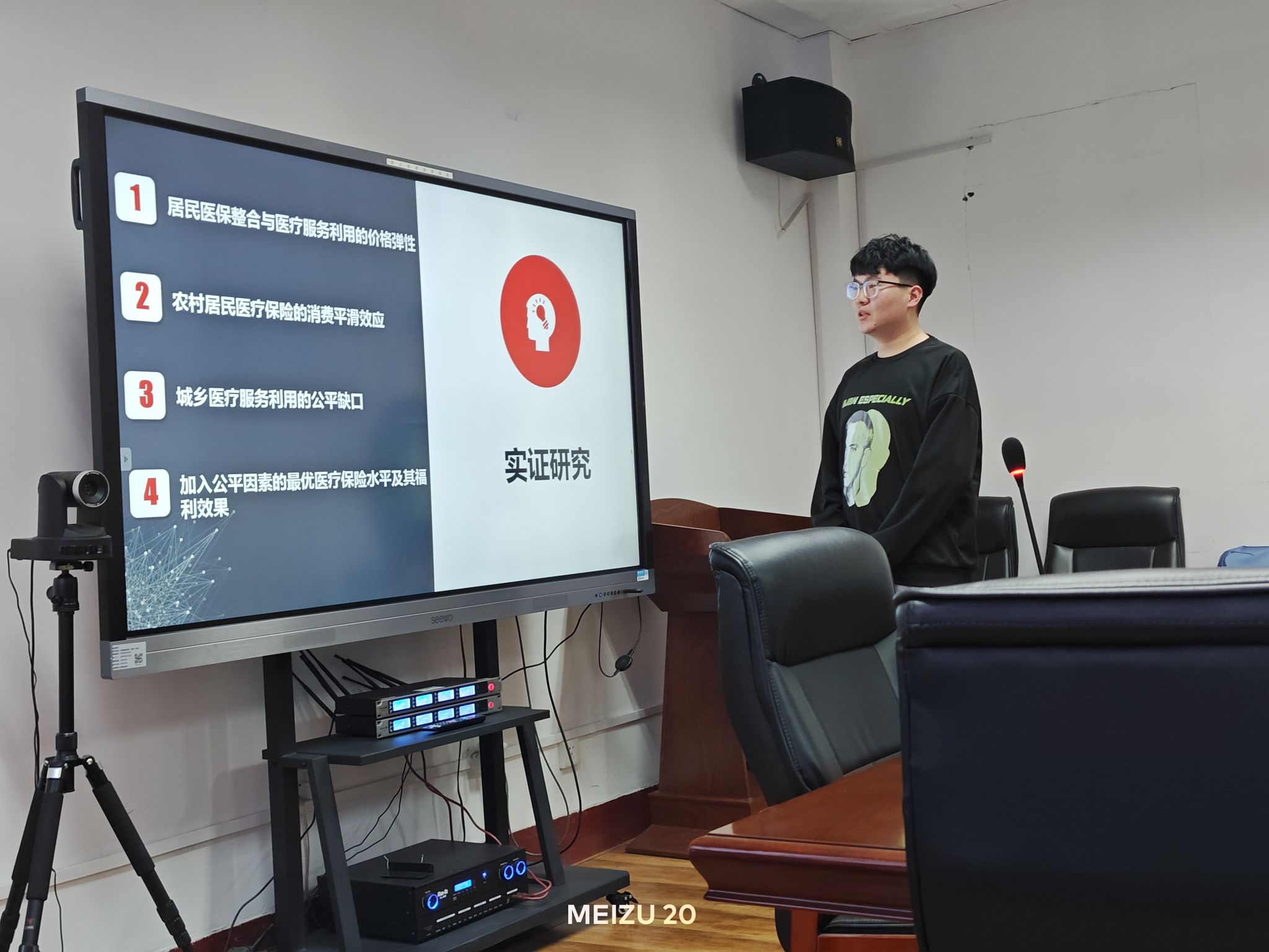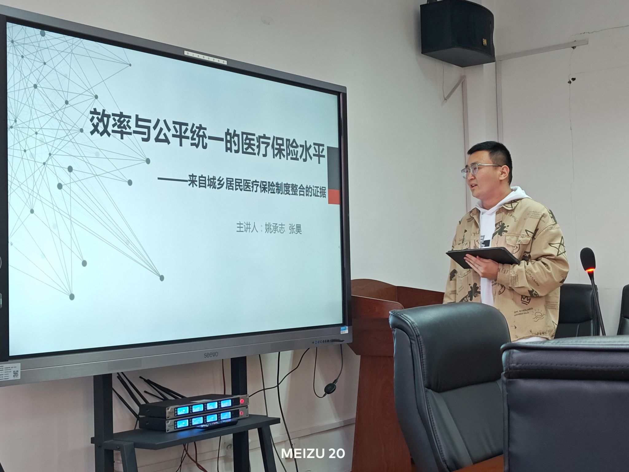 在本次学术沙龙中,姚承志向同学们介绍了论文的研究背景,文献综述以及创新点,并通过一个加入政府补贴因素及公平因素两方面考量的理论模型,计算得出最优的医疗保险。随后,张昊从四个方面进行实证研究分析了居民医保的最优报销比例,并得出了相应的结论和政策建议。