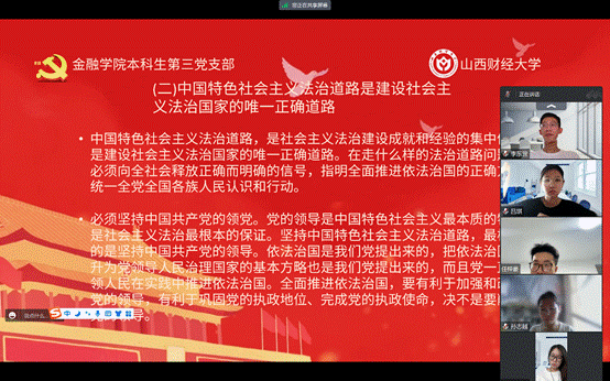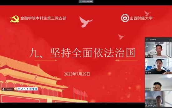 概要:welcome光临必发集团本科生第三党支部在7月29日进行了第九章和第十章的学习,本讲的主要内容是“坚持全面依法治国”和“铸就社会主义文化新辉煌”,由本科生第三党支部预备党员季雅婧带领大家学习,本科生第三党支部邱马玥主持并总结发言。