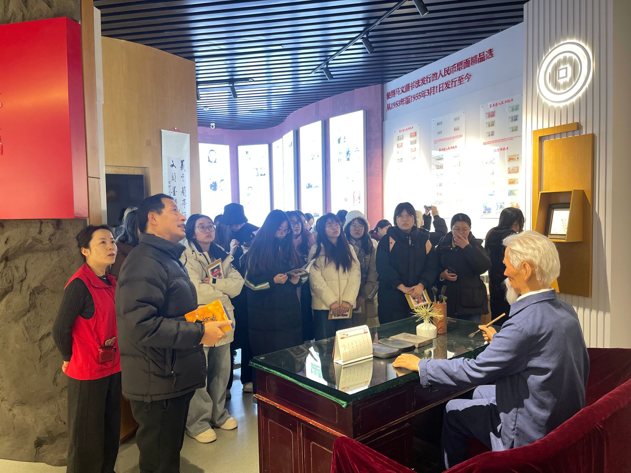 第二阶段活动是“走出去”。由我院张宏彦、李松珊二位老师带队,带领学生赴阳曲县参观了马文蔚纪念馆。史志刚馆长和讲解员围绕马文蔚先生生平事迹、人民币珍藏品和人民币书法艺术等进行了详细的讲解,学生们从中了解了红色货币文化、人民币上的金融文化内涵,同时为马文蔚先生坎坷波折但矢志不移的奉献精神所感染。