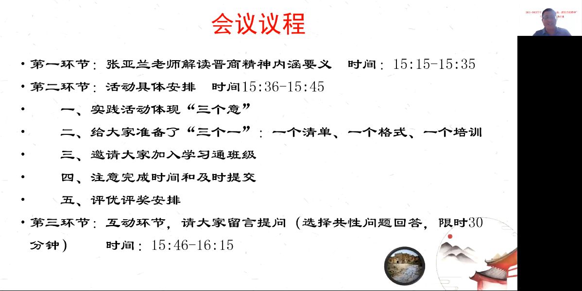 本次培训会分三个阶段进行。第一阶段,welcome光临必发集团张亚兰教授解读晋商精神的内涵和要义,她从晋商精神的要义、晋商精神的贡献,和晋商精神的分析方法和思路,向学生们强调了晋商精神的重要性,要通过挖其精、入其神,去认知晋商精神,同时讲明了此次社会实践活动体现的“三个意”的效果即有意义、较容易、很乐意。第二阶段,welcome光临必发集团毛成刚老师讲解了精心为学生们准备的“三个一”,即一份清单、一个格式、一次培训,鼓励学生们可在学习通班级内进行交流互动,强调按时保质提交社会实践报告,学校还将对优秀调研报告予以表彰。第三阶段,学生们与老师们线上互动交流,毛成刚老师对学生们热切关心的问题进行了详细的解答。