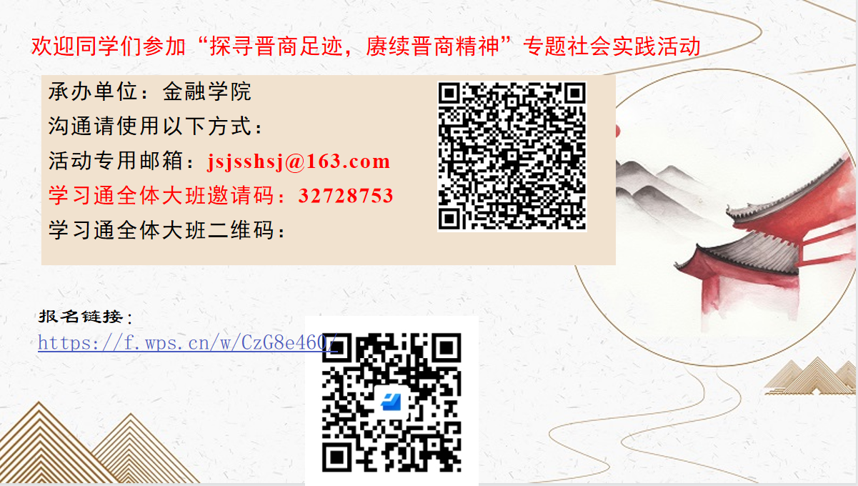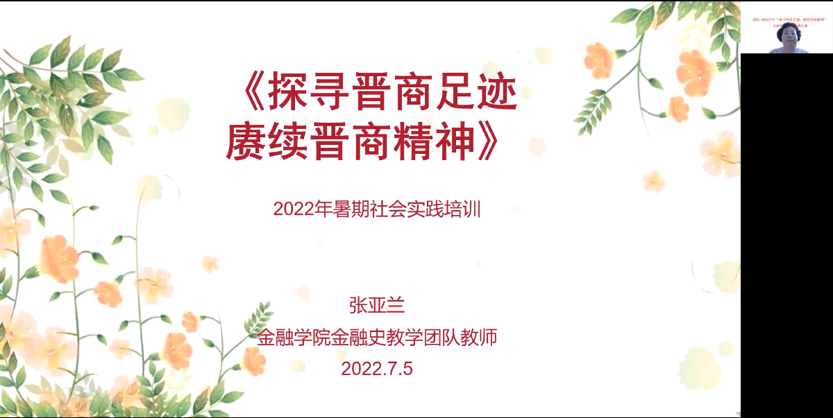 通过此次专题培训,学生们对学校开展此次“探寻晋商足迹,赓续晋商精神”专题社会实践有了更深入的了解,对探寻晋商精神有了更浓厚的兴趣,对专业理论知识与社会实践活动相结合有了更清晰的认识,对完成好此次社会实践调研报告有了更加的笃定,相信此次专题社会实践线上培训活动一定会促进学生们更好的了解晋商精神,使学生们在专业实践中得到锻炼,做勇于传承民族优秀文化和敢于担当时代重任的大学生。