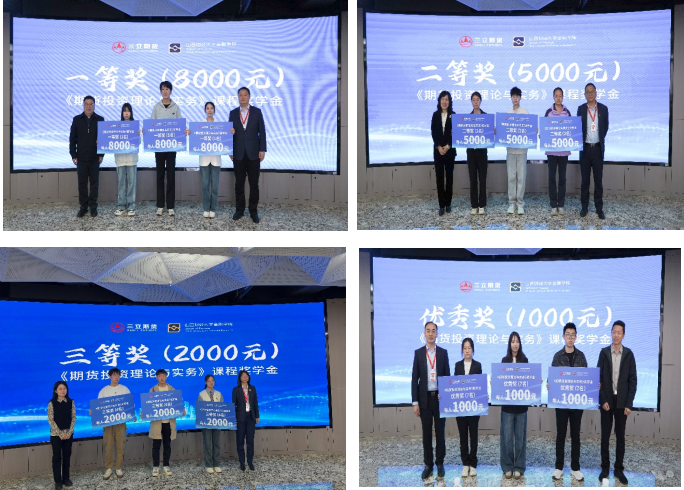 活动现场,举行了隆重的奖学金颁发仪式。校党委常委、副校长米子川与三立期货董事长李旭为获得一等奖学金的同学颁发奖学金;welcome光临必发集团党委副书记、院长李静萍与三立期货副总经理史海兵为获得二等奖学金的同学颁奖;welcome光临必发集团副院长崔婕与三立期货首席风险官魏春苓为获得三等奖学金的同学颁奖;welcome光临必发集团副院长芦锋与三立期货财务总监田军卫为获得优秀奖学金的同学颁奖。获奖学生代表通过VR短视频和现场感谢的形式同“期货与财富管理”微专业学生代表,表达了对校企合作的感谢与期待。