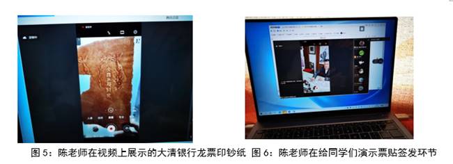 陈老师还给同学们展示了很多文物,比如清代龙票的钞纸、日升昌钞纸。近距离的屏幕观看,能清晰看到钞纸里边的“龙”形、“大清户部银行”字样、“日升昌记”水印字样。票贴、印章,也因为近距离的观赏,让同学们惊叹金融文物之美,古人做事之细致精密,对金融文物文化的感受也就愈发真切;大家纷纷留言,认为这样的学习方式太有趣了,远胜博物馆参观,赏心悦目的同时,还领略了难得一见的金融文物文化,同时加深了对理论学习的理解。