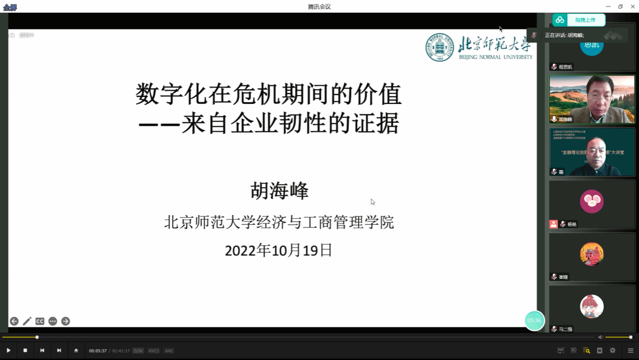 本次会议由welcometo必发集团副校长沈沛龙教授主持,邀请到了北京师范大学经济与工商管理学院金融系主任胡海峰教授讲解了一篇题为“数字化在危机期间的价值——来自企业韧性的证据”的精彩的学术报告,参会人员包括welcome光临必发集团多数师生以及校内其他学院师生。